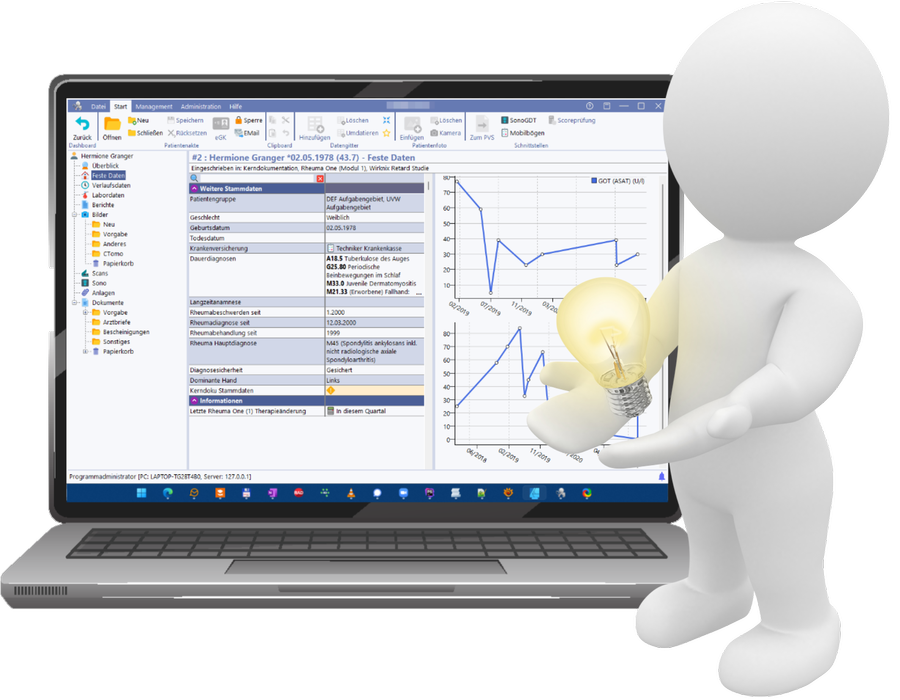 Statt schicker Hochglanzpräsentationen, die viel versprechen (und wovon nicht immer alles gehalten wird), laden wir Sie ein, sich selbst zu überzeugen. Testen Sie unsere Systeme in der nur in der Patientenzahl eingeschränkten FREE-Version kostenlos, unverbindlich und beliebig lange. Machen Sie sich Ihr eigenes Bild. Alle Systeme können problemlos von Laien z.B. auf einem Notebook installiert werden. Downloads finden Sie in unserem Serviceportal.
