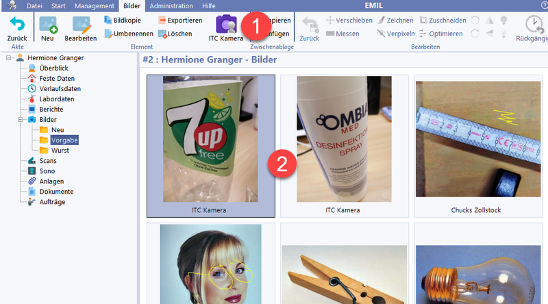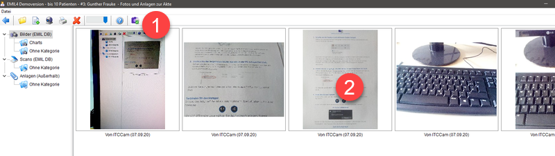So landen die Bilder dann in der Medienverwaltung. Unter (1) können Sie sehen, ob die Emil-Kamera verbunden ist. Jedes erzeugte Foto landet nach ein oder zwei Sekunden in der Vorschau (2) und ist in der EMIL-Datenbank korrekt und fest mit dem Patienten verknüpft sicher abgelegt.