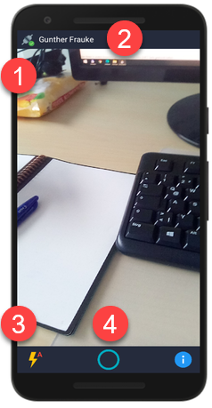 Unter (3) können Sie zwischen Blitz aus, automatischem Blitz und Blitz bei jedem Foto wählen. (4) ist der Auslöser, der das Foto aufnimmt. Es wird anschließend sofort verschlüsselt an die EMIL-Akte überträgt.
