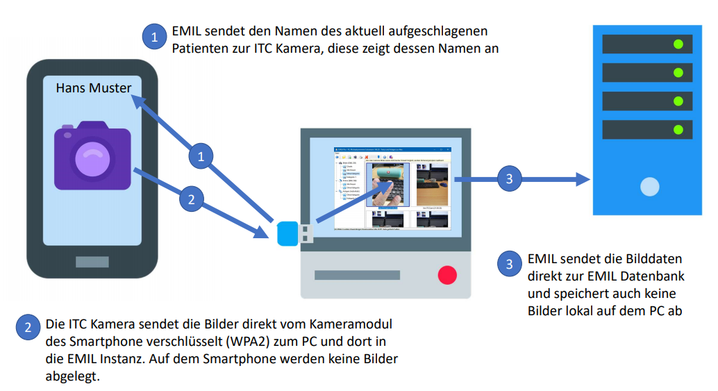 Mit der ITC-Kamera können Sie datenschutzkonform Fotos direkt in die Akten der EMIL-Systeme aufnehmen. Diese werden verschlüsselt zu einem gekoppelten PC übertragen, auf dem das EMIL-System läuft und dort direkt in die Akte gespeichert.